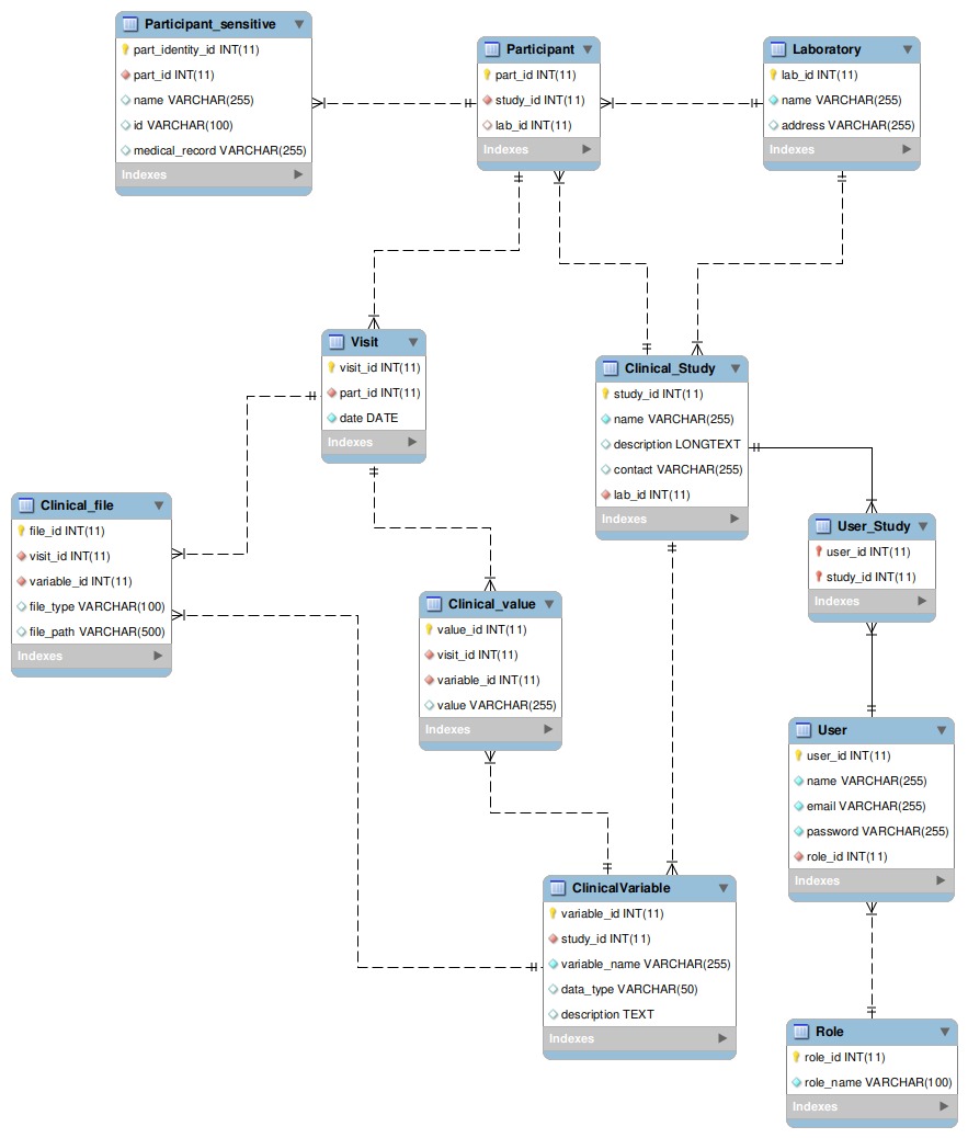 Clinical Data. Composed by single data items (i.e. age, blood presure, etc), and data files (i.e images, sequencing data). Since the database should server several trials, the identification (label) of the stored data cannot be static, although should be part of a known set of variables. Some of the clinical data is longitudinal, i.e is is obtained along time in a series of visits to the hospital, all data and the corresponding visit dates should be stored.